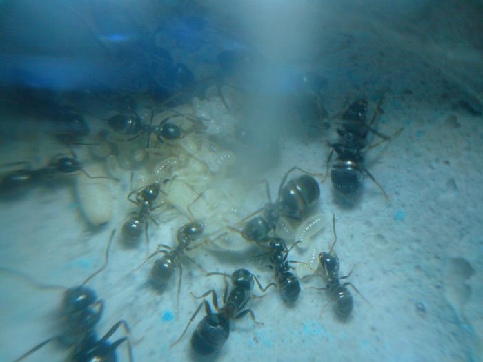 Переселил я семейку в формикарий. Их: матка, несколько личинок, приличный пакет яиц, 10-15 коканов, 24-26 рабочих, переселял насильно, т.е. с помощью лампы, за 10 минут перебежали. Теперь буду ждать когда разростутся.