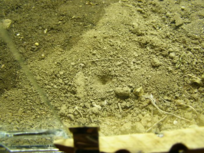 Поселились эти муравьи у самого края переднего стекла, так что возможно какая-то часть их муравейника будет видна. Пока же он очень маленький и расположен очевидно чуть дальше чем само стекло. Вход находится на расстоянии ок. 1см от стекла.