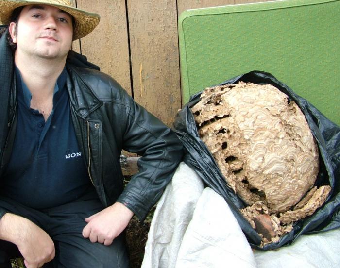 Я бы в штаны наложил сидеть рядом с такой бандурой (даже за километр, в костюме, не решился бы подходить). Притом, ладно он был бы пустой, а там вон шершни лазиют. Я на всю жизньих укус запомнил. Человек на фото явно не в своём уме.