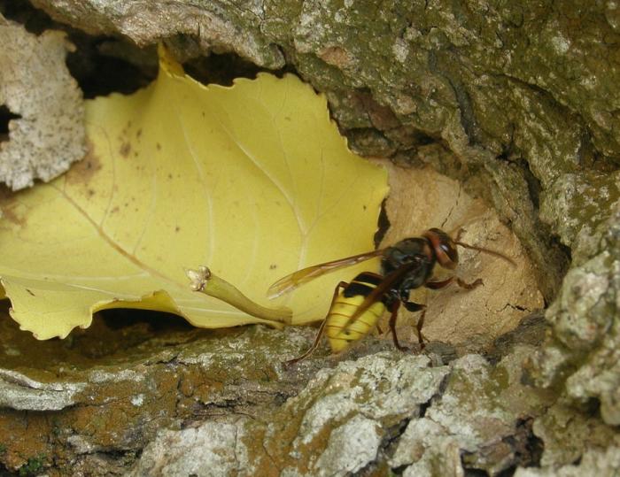 Вот снимок шершня у входа в гнездо, сделаный в начале сентября этого года( вход я специально листком прикрыл чтоб шершень не убежал туда пока я его снимаю).