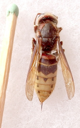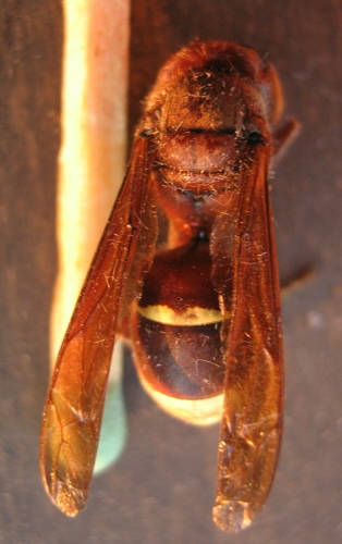Нет, это V. crabro на снимке, у него просто брюшко сложенное, к тому же у ориенталиса второе темое кольцо намного лучше выражено и зубцы почти не видны, и на конце брюшка тоже темные кольца. У нас степная местность и шершней очень мало, вернее их как бы нет, я нашел только одно место где они регулярно гнездятся- в старом искуственном лесу, в сухих осинах. Они гнездятся регулярно в одном из мест, но мне кажется что они намного шире распостранены по лесу, но найти их гнезда не просто, семьи у них маленькие и нет такого оживления как возле гнезда германских ос. Вот ниже на снимках- первый снимок это шершни что живут в той посадке, а вот второй- вот это похоже и есть ориенталис, я нашел его раздавленным на дороге просто в городе! Дело в том что по картам ареалов у нас нет V. orientalis, и я был очень удивлен когда нашел его.
