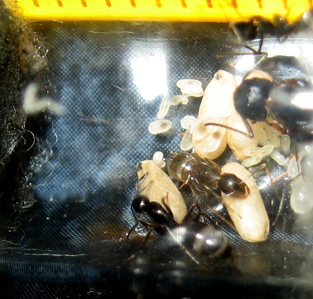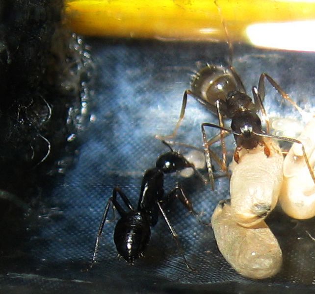 По поведению эти муравьи заметно сообразительнее всех моих предыдущих муравьёв. Когда я открываю пробирку что-бы их покормить или убрать мусор, 3 или 4 рабочих сразу кидаются к выходу, но как минимум один всегда остаётся с маткой и расплодом и старается его поскорей куда-нибудь спрятать. Также недавно при кормлении один рабочий выбежал, но мне не пришлось его долго ловить - он потом сам залез в пробирку и я быстренько её закрыл. Если же вылезают лазиусы или мирмики, их потом обратно не загонишь.