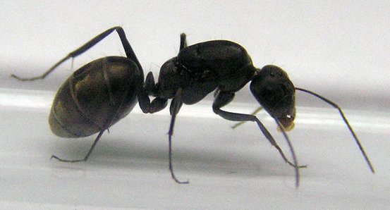 Матка номер четыре. Как выразился Валера: "какой-то псевдо-полирахес". Одна. И в довольно печальном состоянии. Такое ощущение что у неё ДЦП. Движения какие-то неуверенные и лапки подгибаются под себя. Особенно левая передняя. Что, однако, не помешало ей в день пересадки отложить яйцо!!! :))) Размер этой матки 13-14 мм. Цвет - чисто-чёрный с сильным отливом.