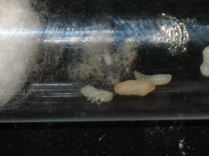 В сухом остатке у королевы осталось 4 упитанные личинки и одна куколка. Не знаю, скоро появится первый рабочий или нет, но в последнее время матка начала отказываться от белкового корма ( очень стыдно говорить, но совету Azazel'я я еще не внял и новую колонию дрозофил не завел).