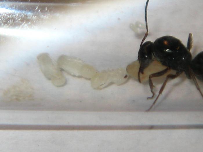 К настоящему моменту окуклились уже все личинки, причем 4 из 5 куколок не имеют кокона, т.е. удобно наблюдать за их развитием. У трех открытых куколок все выпирающие части прижаты к телу, а у одной они почему-то расправлены. Боюсь, из этой куколки может получиться уродец, как в блоге ''О закладке и развитии семьи Formica'', живущем по адресу http://antclub.org/node/608. Хорошо, хоть не первый блин будет комом, если будет...Кроме того, обнаружил сегодня +3 яйца. Думаю, на эту зиму никто из моих подопечных не отправится ночевать в холодильник уже точно...