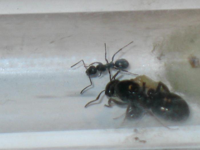 мед кушает вроде активно и на мои вторжения в пробирку агрессивно реагирует - однажды умудрилась уцепиться за пинцет и покинуть пределы своего скромного жилища, бегала у меня по руке, огрызалась, очутилась на столе и с полминуты по нему бегала, пока я не умудрился каким-то чудом ее обратно запихнуть... Чуть инфаркт не заработал с ней, никто из других мурашей так себя не ведет( лазюки хоть любознательные, но жутко флегматичные, про мирмик-тормозов вообще молчу).