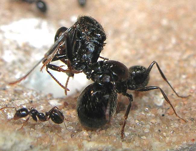 Вначале я заметил муравья, который носился по арене с чьим-то отгрызенным брюшком. Брюшко было явно великовато даже для солдата - подумал, что приговорили одну из молодых маток. Не прошло и часа, как из муравейника на арену, выкатился небольшой клубок муравьев, и в этом клубке явно угадывалась матка, причем бескрылая.