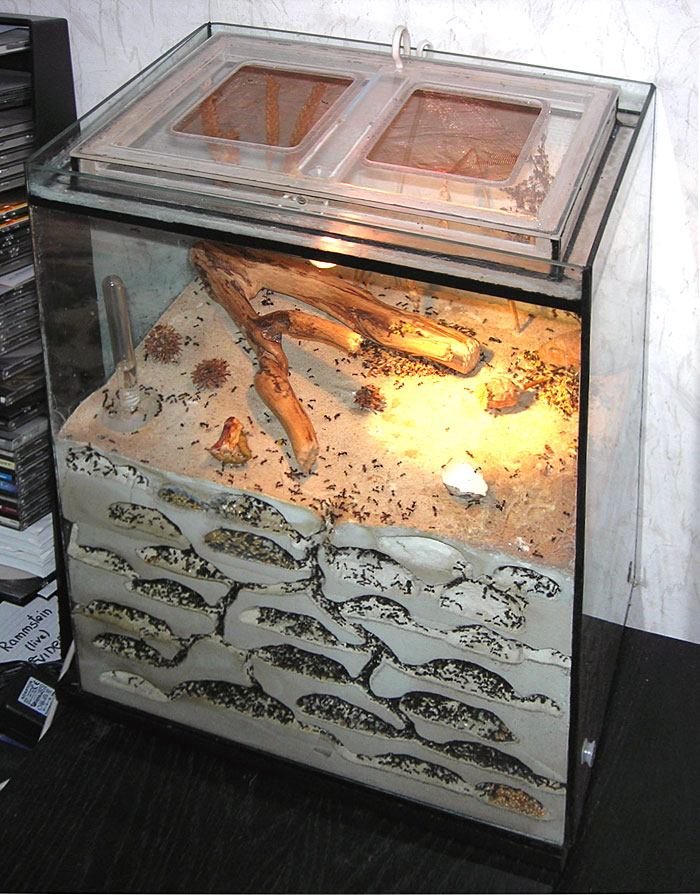 Сегодня доставил домой новый формикарий. В багажнике перевозить не решился, "посадил" его на заднее сидение и, как положено, пристегнул ремнем безопасности. Довез благополучно, (кстати весит он 19,5 кг.) установил его на столик, включил свет, и чтобы предотвратить случайные побеги, в расположенный по периметру бассейн, залил воду. Затенил "подземную" часть муравейника, соединил формикарии трубкой, малый формик осветил люминесцентной лампой, т.е. не грел. Приоткрыл крышку, и