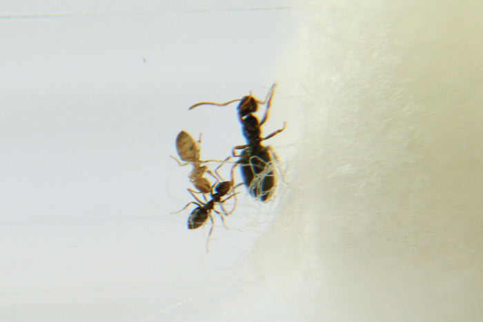 Видела одного муравья, сильно раздутого. И наверх лезут, всё время кто-нибудь бегает по крышке арены. На арену иногда кидаю им разные ветки и листья, чтоб было занятие. Давала веточку розы с несколькими тлями, вроде тлей унесли, во всяком случае они исчезли.