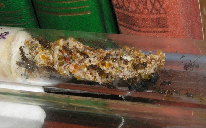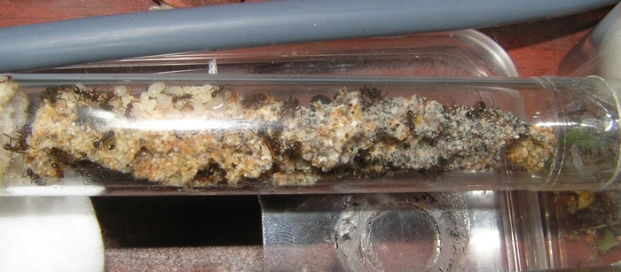 Грибница вплотную подошла концу пробирки, видимо поэтому муравьи стали ее делать на арене (хороший знак).