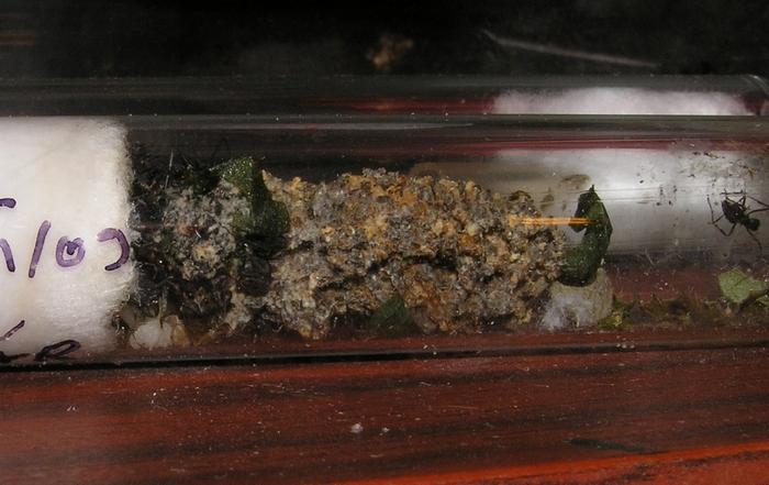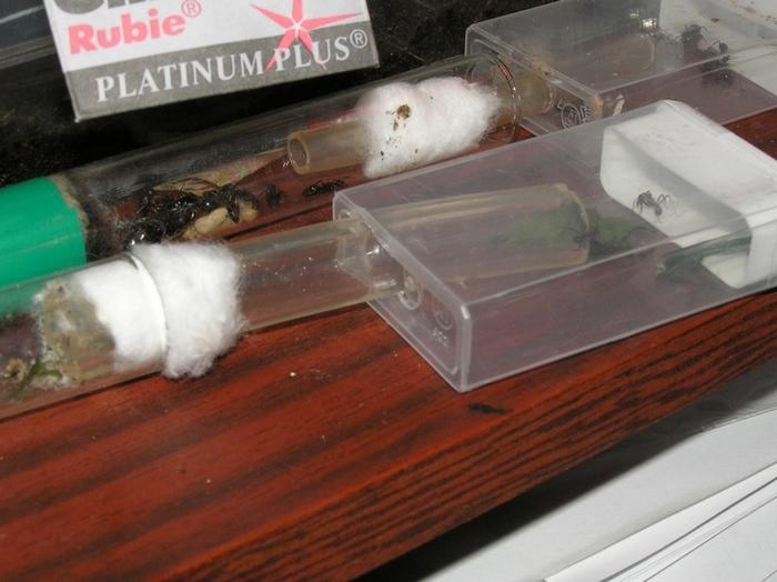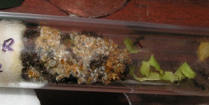 Посылка была в пути почти неделю и все с нетерпением ожидали их приезд. К огромному моему счастью мама с рабочими чувствовали себя неплохо, хотя и были сильно проголодавшимися (сразу набросились на лист Розы). Грибница за время путешествия была несколько попорчена и рабочие за сутки эту часть открошили и вынесли в дальний угол пробирки. Чтобы увеличить пространство я подсоединил арену которая немедленно была обследована и за вечер заполнена мусором из пробирки. Спустя неделю случайно были обнаружены яйца (надеюсь отложенные уже у меня) спрятанные в глубокой камере. Сейчас пробирка подведена к арене из-под "всеми любимых конфет"))) с множеством вентилляционных конфет и второй большой пробиркой (пока ей не интересуются). Ниже фото в хронологической последовательности.