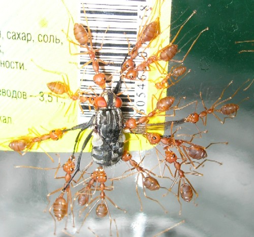 Через пару дней зашел ко мне знакомый и говорит -"а давай-ка живого и функционирующего полностью таракана кинем ", я сначала переживал что таракан им на арене шороху устроит,но оказалось совершенно по другому, он сделал круг почета по арене,последний круг почета в своей жизни,дальше было страшно "кишки на ветках" мало того что они облепили его как Гулливера.... затем пришел один добрый солдат и откусил ему все ножки другой который подошел позже принялся за усики,кстати солдаты очень трусливые по сравнению с рабочими.