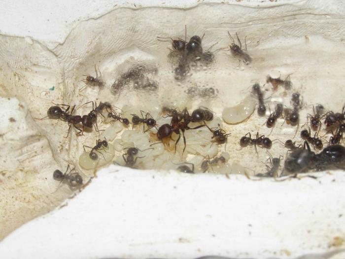 Поскольку мои засранцы прогрызли вату в пробирке до воды и она начала поступать в пробирку я организовал срочное переселение в форм. Единственное, что плохо - я его переувлажнил. Матка с личинками выбрали камеру с небольшое влажностью, а яйца и самые маленькие личинки перенесли в камеру с максимальной испариной.