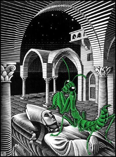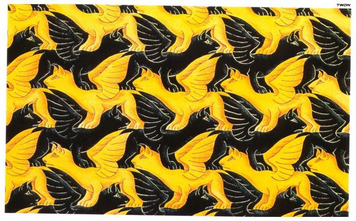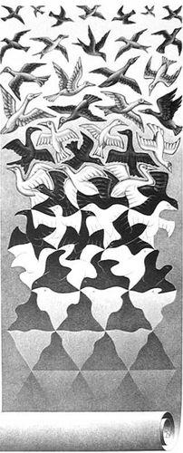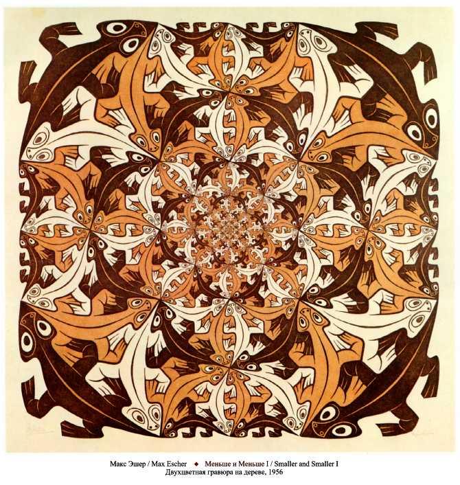 Говорят, Эшер видел мир в четырех измерениях. Когда-то попадалась его репродукция, где изображена рыбка в осеннем озере. Она была оранжевого цвета. Создавалось впечатление, что эта рыба всплывает из бездны и сливается с облаками, после чего теряется чувство пространства и уже не понятно - где верх, где низ. Рыбка как бы зависла в бесконечности.