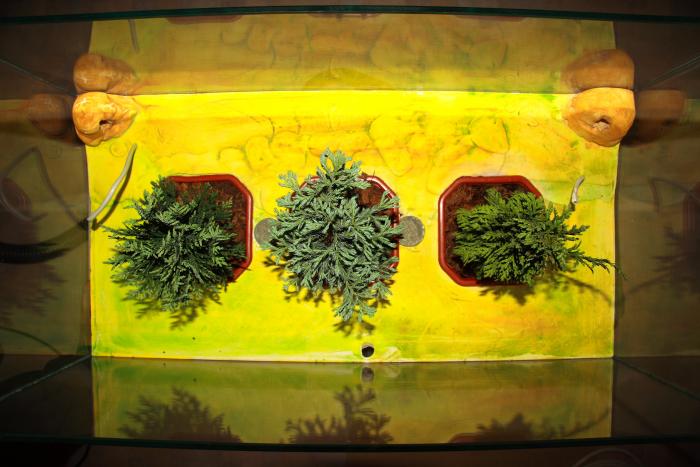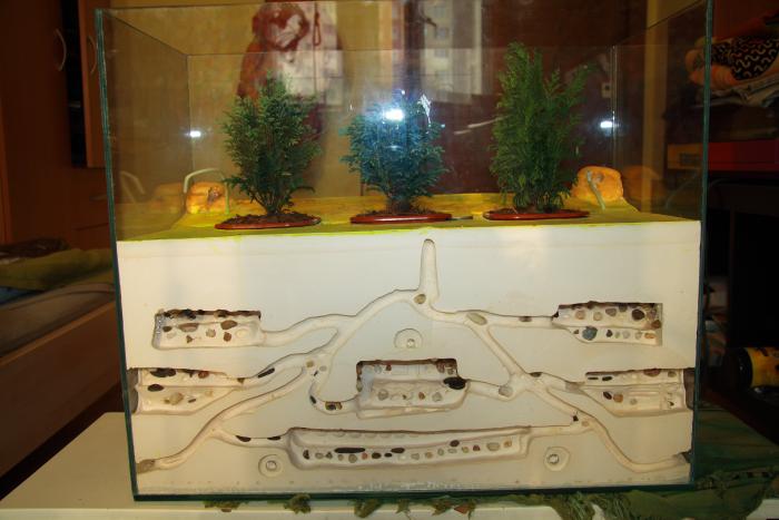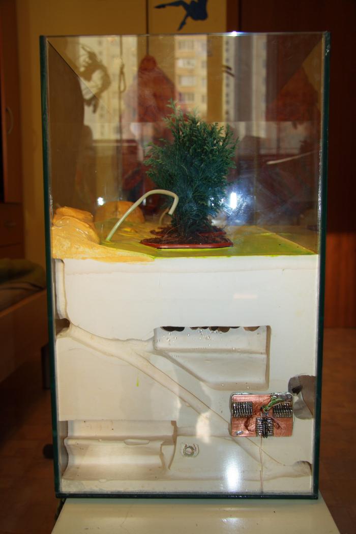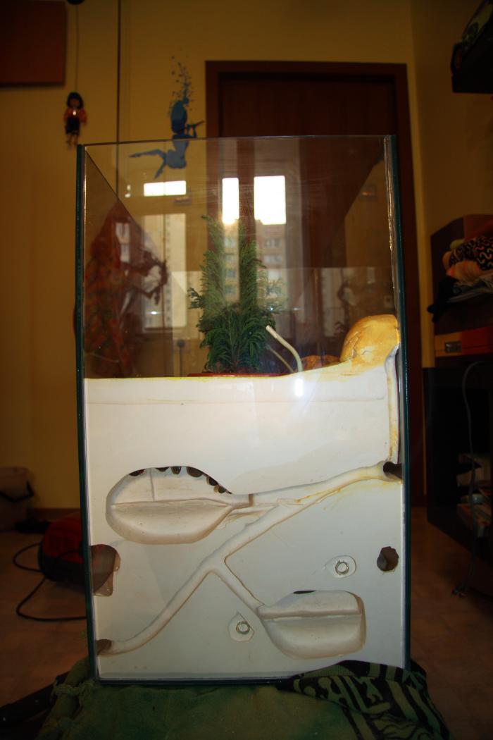 Многое не сделано. Земля не затянута (это не проблема так как горшки легко и плотно вынимаются). Бортов нет ... из плохого то что уже точно перетравилась одна из проволок отопления , и быстрее перетравится свет если им светить ) Между стеклом и гипсом не 100 % прилегание .(