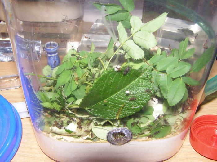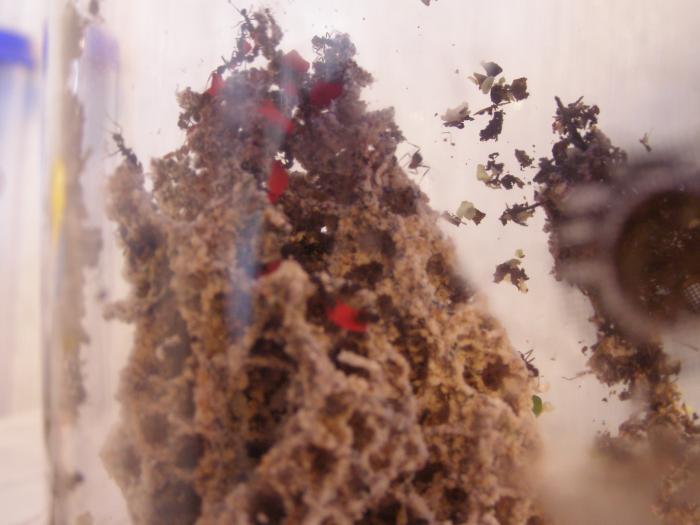 Мои муравьшки полностью восстановились. Начал делать запасы листьев на зиму, поскольку сейчас аппетиты у них растут в геомметрической прогрессии. Не заню кто у них там главный архитектор, но башня скоро завалится на бок. Они всю ночь пытались приделать ее к стене.