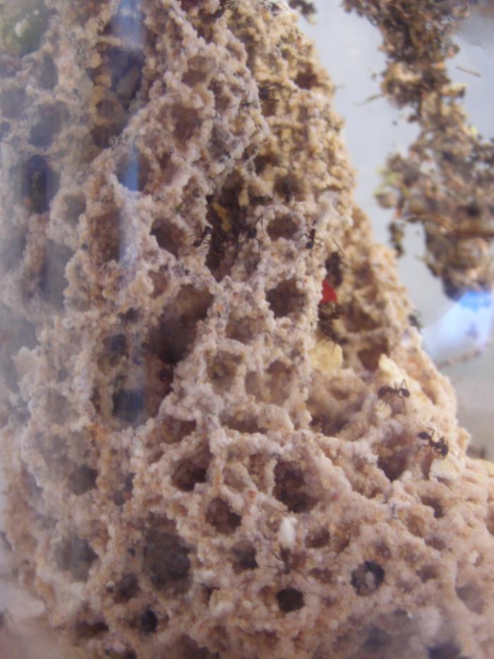 Да это все молодые мурахи. При чем только сейчас стали появляться именно "листорезы" (кто занимается непосредственно резкой листьев). Есть очень много маленьких, старых, черных бездельников, который просто тусуются на гипсе и вообще ничего не делают.