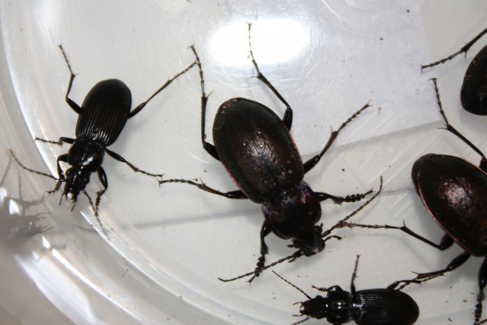это жужелицы на фото как минимум 3 вида, могу назвать 2 вида лесная,полевая ,а чёрные мелкие напоминают жужелицу выпуклую,активные хищники питаются в дикой природе слизнями,червиями и другими беспозвоночными, вот видео охоты