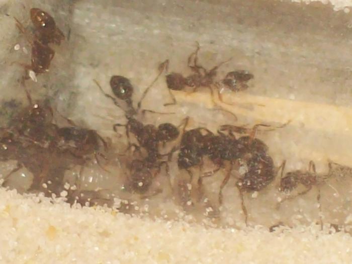 мирмики начали капать нору у камня, но вроде ни матка ни расплод не собораются переезжать в новое убежище