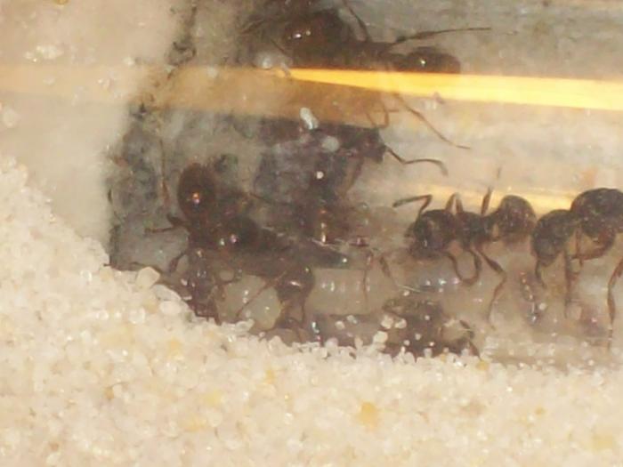 нашёл сегодня на улице какуюто личинку и бросил им, Муравейка загнал личинку к ним поближе, и вот они получают свой первый опыт в охоте на добычу)