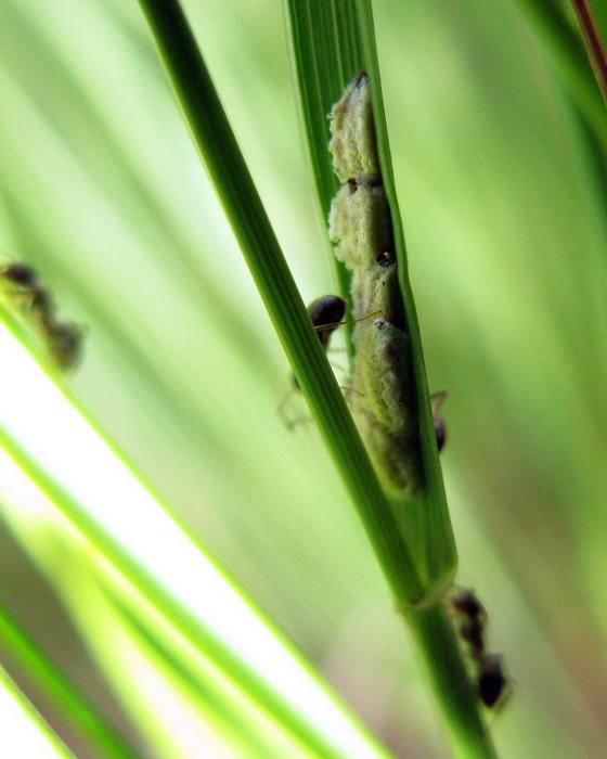 Вчера вечером возращался с прогулки, заинтересовался довольно таки большим муравейником-кочкой лазиусов. Активность у них была уже небольшая. Но взгляд привлёкли травинки которые росли из муравейника и вокруг него. В пазухах травинок были какие то странные коконы за которыми старательно ухаживали рабочие лазиусов, даже и не могу предположить что это такое. Единственные "домашние" животные лазиусов которые приходят на ум - тля, неужели это она ?
