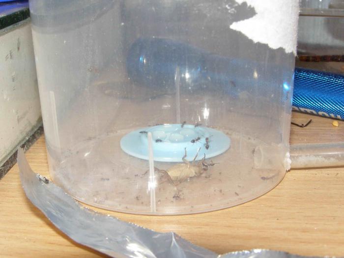 Пока ведут себя очень странно (видимо отходят от стресса из за перевозки) прилипли к пробирке и не двигаются. Только 3-ое отважных рабочих бегают к капле сиропа и к сверчку. Остальные тупо сидят возле матки и ждут, когда их покормят. Прикольно двигают "попой" когда едят или что то находят.