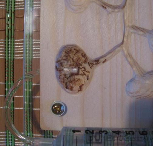 Видимого места соприкосновения ваты с деревом я не углядел. Скорее всего кто-то из муравьев выволок несколько волокон ваты наружу. Необходимость переделки была очевидна. Хорошо, что мураши и кладка в камере отсутствовали, что позволяло спокойно изымать из формикария трубку (несколько раз ... :) ). Да и в это время они были заняты локальной войной с тараканом - им было не до моих вторжений :).