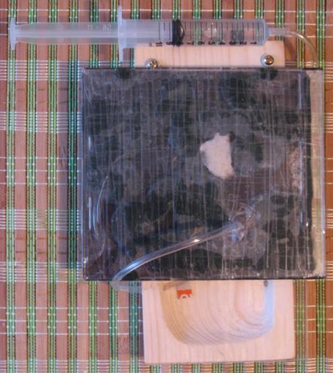 Во-вторых, необходимость разместить "резервуар" с водой ниже уровня на котором расположена трубка "поилки" в формикарии. Иначе, посредством получившегося сообщающегося сосуда, вода перелилась бы полностью в формикарий, даже полностью забитая ватой трубка ее не останавливала.