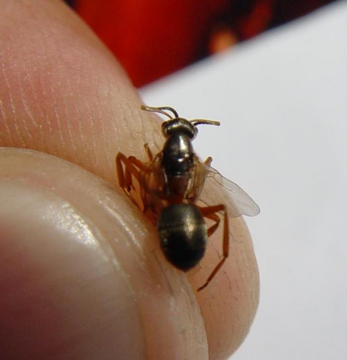 это муравей. точняк. поймал на тропинке в редколесье сегодня... (там и ласиусов маток куча бегала...)... летать оно не может... просто маленькая для матки и пропорции брюшка не солидные для беременной)) - вот и озадачился... может и похоже на осу чем-то... так они же родственники... осебенно если самцов смотреть...