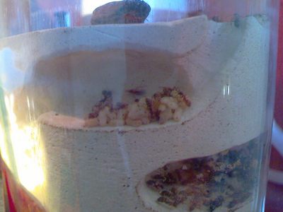 Та это с тех времен остались когда хотел как-нить им уюта добавить. Ничего более подходящего не придумал вот и сыпанул на внутреннюю аренку горсть опилок. Мурахам опилки эти, за неимением альтернатив, понравились и они из них подобие купала делали. Часть естественно во внутрь провалилась/была перенесена. Сейчас уже достать их не представляется возможным, да они и не мешают. Мураши ими частенько вентиляцию регулируют, закладывая в нужных камерах мелкие отверстия в стенке банки.