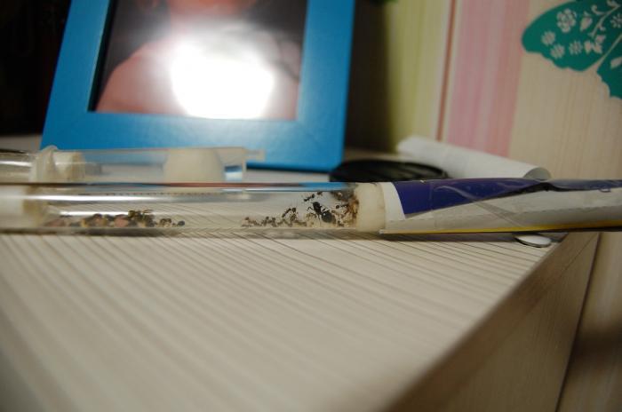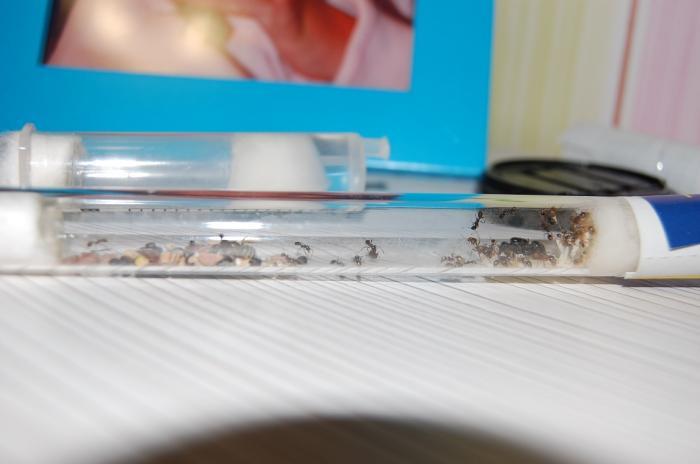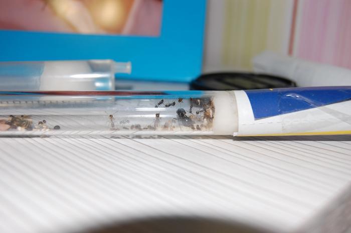 Через 5 минут первый разведчик(у меня есть одноусый - везде первый, и тут, естесна, тоже:) уже зашёл в стекло. Пошарился, выбежал, обследовал трубку. Позвал второго - вдвоём внутри пошарились, обследовали трубку. Позвали третьего. Через 15 минут несколько официальных делегаций уже вовсю из шприца в пробирку шастали, обсуждали, устраивали симпозиумы и консилиумы.