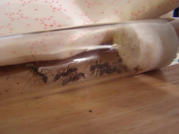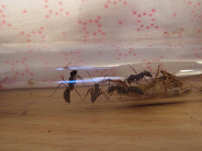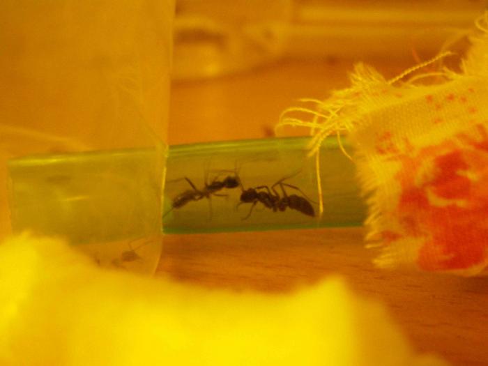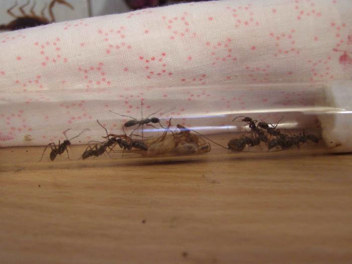 Подключил им арену и новую чистую, большую пробирку. Дал сверчка, они затащили его в старую пробирку и там лопают. Фотографии плохого качества, так как старая пробирка очень очень грязная. Муравьи очень агресивные, жалом пользуются при первой же возможности. Когда их будет много попробую на себе силу укуса.