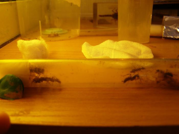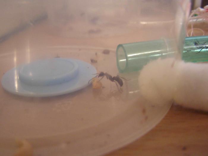 Мои ребятки осваиваются, начинается движение по арене. И (тьфу, тьфу, тьфу чтобы не сглазить) уже второй день один муравей в мандибулах носит что то очень похожее на пакет яиц. К сожалению, получше сфотографировать не получается. Скоро куплю зеркалку вот тогда будут хорошие фотки.