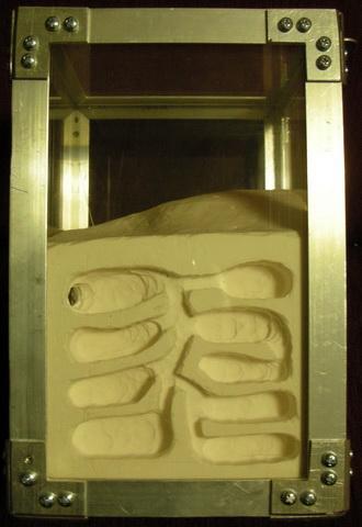 Для увлажнения внутри куба из алебастра просверлены три глухих отверстия, расходящихся из одной точки трезубцем - два по диагоналям сторон куба, одно в противоположный нижний угол куба, нв арене в отверстие увлажнения вставится трубка с закрытым сеткой отверстием, увлажнять через сетку в крышке шприцем, влажность куба контролировать по гигрометру.