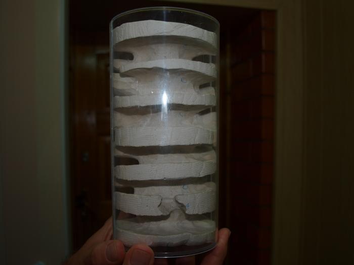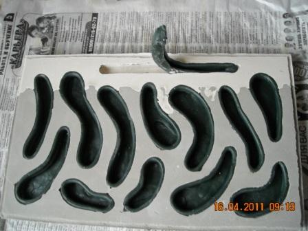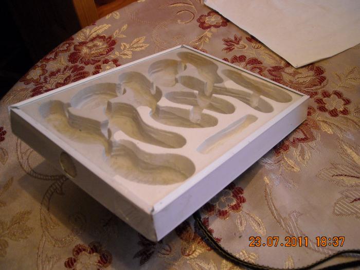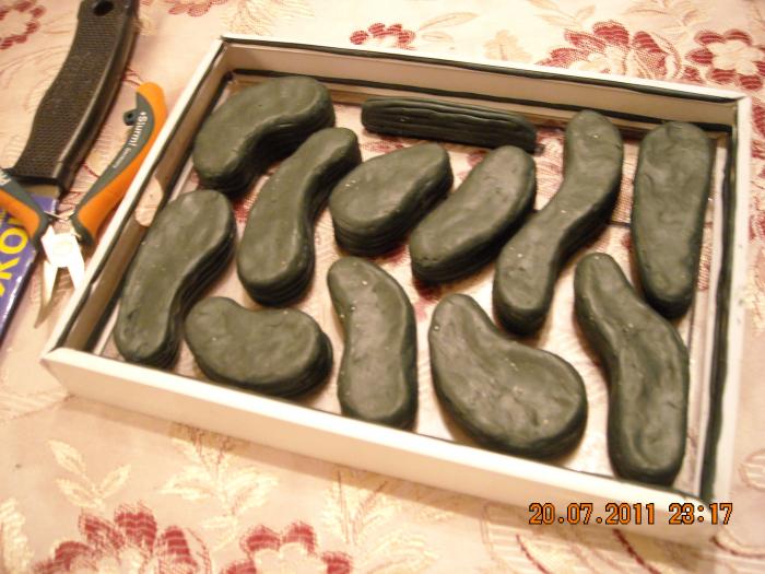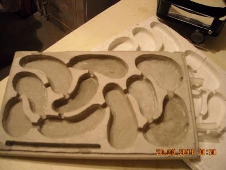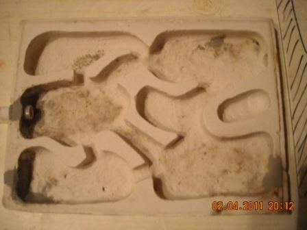 А это фото формика сделанного из гипсо-цемента, где последнего было слишком много (белый цемент 2 части и гипса 1часть). После процедуры подсушивание-увлажнение-подсушивание его распёрло сначала, а после он и вовсе рассохся и сдох.