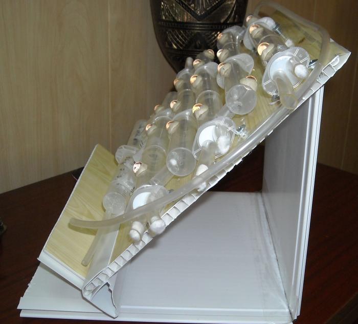 Продолжение поиска оптимальности: сборный формик из шприцевых-модулей-на сегодня для меня это возможно то, что решит проблему наиболее полного КОНТРОЛИРОВАНИЯ развивающихся колоний. Первые переселенцы в формик этого типа моя первая колония вагусов (kentuky у тебя рука лёгкая:)) У этого формика можно менять угол наклона (слишком вертикально-лучше вентиляция, но труднее подниматься мурашам-и так уже внутри вертикальных переходов ножом-пилкой поперечные царапины наделал). Более горизонтально-хуже (как мне кажется) вентиляция. Но по крайней мере на любом этаже-ярусе можно дополнительный шприц-увлажнитель "вставить"практически не нарушая обычного течения жизни подопечных и никуда их при этом не переселяя. Если у кого есть замечания, советы заранее спасибо. Блестящие стеклянные шарики-это затычки для тех.отверстий, любое может стать "окном вентиляционным"или чем-то ещё (не считая возможности доступа к расплоду-личинкам и куколкам)