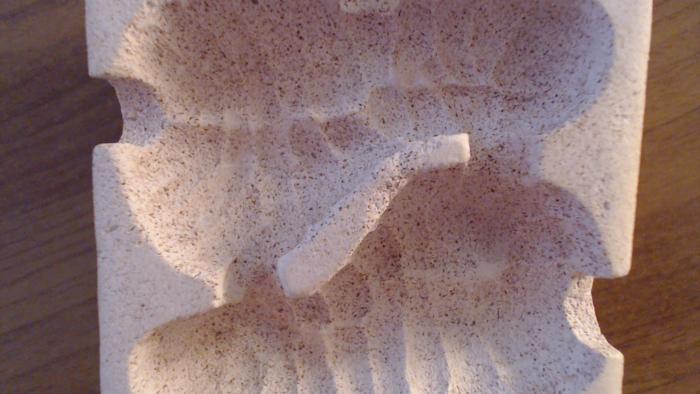 Берём бокс ("бокс для бумаги для заметок"), вырезаем бумагу по размерам, оклеиваем эту бумагу прозрачным скотчем. Заливаем жиденьким гипсом (гипс затворяем на воде, куда бросили толчёного красного кирпича, просеянного через сито), через сутки вынимаем за "ушки" бумажные (не забудьте: обклеенные прозрачным скотчем). Ножом камеры вырезаем какие нравятся на свой вкус и лад (как фактура материала? - в естественном освещении куда краше смотрятся) Моем со щёткой водой под краном. Сушим отливку. Суём в пластиковый бокс. Типа готово.
