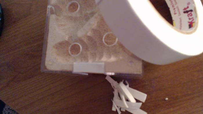 1. Увлажнение - 3 слоя квадратиков вырезанных из ватных дисков(в стене слева возле ватки отверстие увлажнительное, залепленное пластилином - через него, если понадобиться и весь мокрый"коврик" утащить секундное дело).