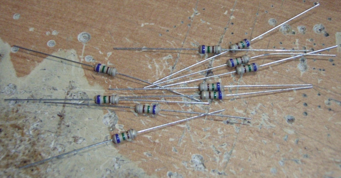Для мощности 6,5 Вт нам необходим резистор на 7,5 кОм, поскольку нам нужен длинный резистор, то покупаем 10 резисторов на 750Ом мощностью 0,25 Вт