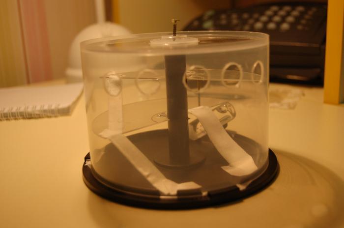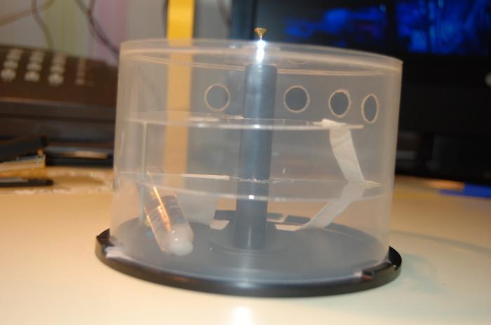 Вот сделал из коробки от СД-дисков. Одну прозрачную болванку пустил на крышку, вторую разломал пополам и вывел в два этажа. Таким образом площадь арены увеличилась вдвое, при сохранении компактных размеров. На арене поилка на 0-ом этаже. На второй этаж ведут две лейкопластыревые дорожки, на третий одна. Осталось вентиляцию заткнуть, и проделать дырку под вход. Оцениваем, критикуем, рекомендуем, повторяем :)
