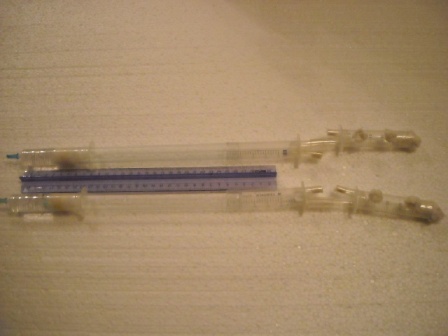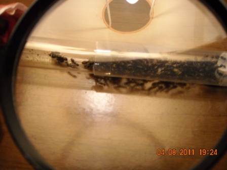 Спасибо ant-S.T.A.L.K.E.Rу-читая его записи дай, думаю, загляну к своим макулатусам. Это модуль длинный из 20мл шприца с водой с одного конца, после идёт трубка из пробирки с выпавшим дном (20мм на 200мм) потом снова 20мл шприц с выходом на арену. На "красных"с позволения сказать фотках это слева нижняя аренка и её модуль. Глянул и ахнул: более половины длины пробирки, прямо по дну занимает полоска сиропа! а мураши по бокам жмутся со всем своим приплодом и на моих глазах один рабочий вытягивал из него(из сиропа) свежевылупленного сородича. Это до недавнего присоединения арены я очень старательно пичкал их сиропом (думал, что весь избыток утекает себе в отверстия внизу головного шприца, ан нет!). И теперь если завтра не получу от сестры из Москвы пробирки большие (21мм на 200мм), то придётся, помолясь конечно св. Жорику и св. Азазелю, усыпыть колонию СО2, скинуть их на аренку под бумажный колпачок, а пробирку и весь модуль помыть и "перезагрузить"семью. Словом весь в трепете и тревоге:(