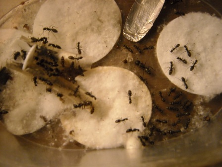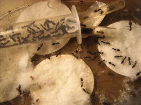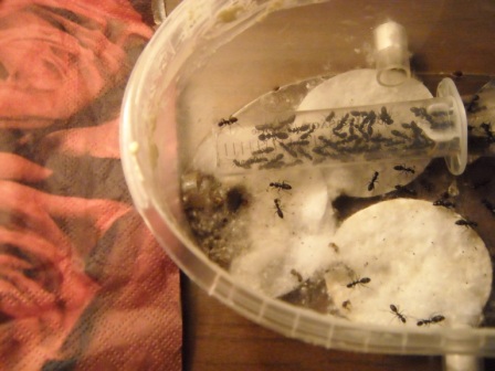 Сегодня раздели разросшуюся семью вагусов никитиных на две: одна осталась в прежнем родном формике, а другую половину ("работников солярия") вместе с куколками размещавшихся в неудачном потрескавшемся от влаги формике(много цемента в гипс добавил) и соединявшихся через одну небольшую арену, отселил после усыпления СО2 в новый формик (гипс и серый цемент=4:1) со своей ареной. В результате: 1 колония-матка+прим.250рабочих+мелкий расплод+немного куколок. И вторая колония: прим.80рабочих+50 куколок и без матки в новом формике со своей ареной. Смысл этих перетурбаций: через пару дней объединить захирелую, чуть не вымершую(по моей естественно вине) колонию от кентуки с безматочным отводком. Конечно отводок скоро (как скоро?-кто знает подскажите пожалуйста) "осознает"себя безмамным, и значит, очень надеюсь, будет готов к объединению с "мамной,"но малочисленной колонией. Как говорится "будем посмотреть."