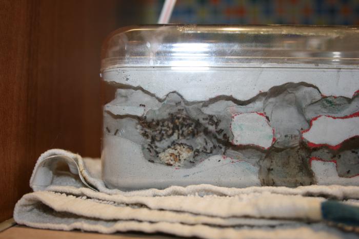 На мой взгляд, в таком небольшом формикарии не обязательно делать дополнительную вентиляцию. Если не переувлажнять, то вполне достаточно отверстия входа и зазоров у стенок. Хороший формикарий. В будущем можно не делать камеры из пластилина, а вырезать с помощью сверла (+ шуруповёрт) и ножа. Тогда они аккуратнее получаются. И не делать камеры близко к нижнему краю, чтобы их при увлажнении не заливало. Но и так нормально.
