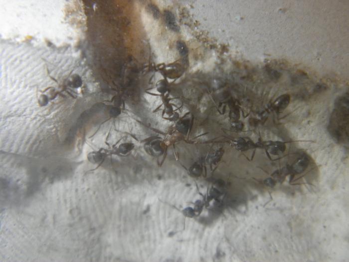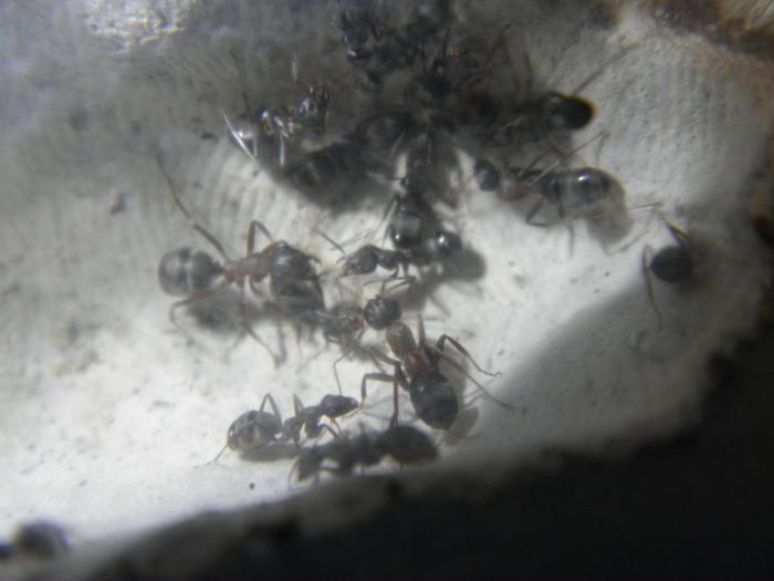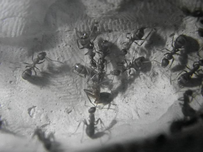 Давно не был на сайте, а муравьи так и живут, только активнасть снизилась, смертей нет. Вобщем всё как обычно у них происходит: бегают, пьют, едят (очень рады кого-нибудь поймать). Только кладки нет 3 месяца, я думаю что зимуют, потому что и нигеры без пополнения. раза 2-3 в неделю даю сахарный сироп, вода каждый день, пьют будь здоров. Но за то время, как самка перестала делать кладки, их стало достаточно для данного формикария. Так что как начнут размножатся, буду готовить новый.