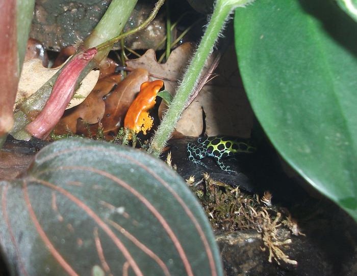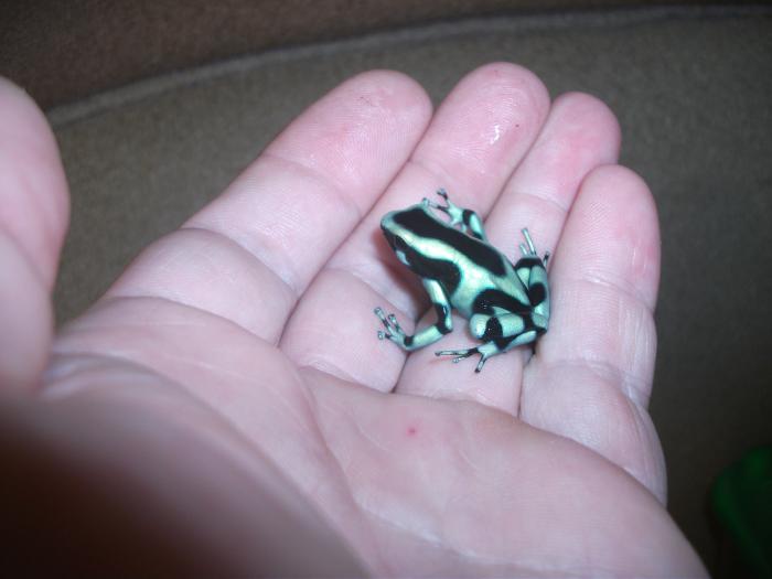 За прошедшие два года изменения коснулись и моей коллекции домашних питомцев. От кого-то пришлось отказаться, например от жаб-рогаток, в связи с их огромным аппетитом (питаются лягушками). Мантеллы 2 штуки погибли в прошлогоднюю жару, остался один самец. Никак не подберу к нему пару. Добавились новые питомцы: относительно крупные синие азуреусы (Dendrobates tinctorius azureus), из Харькова ко мне приехала группа голубовато-зеленых ауратусов (Dendrobates auratus), а из Екатирнбурга - десяток обыкновенных квакш (Hyla arborea). По ящерицам: появились ресничные бананоеды и пара мелких гекконов с Кубы - Сферодактилус нигропунктатус (Sphaerodactylus nigropunctatus)