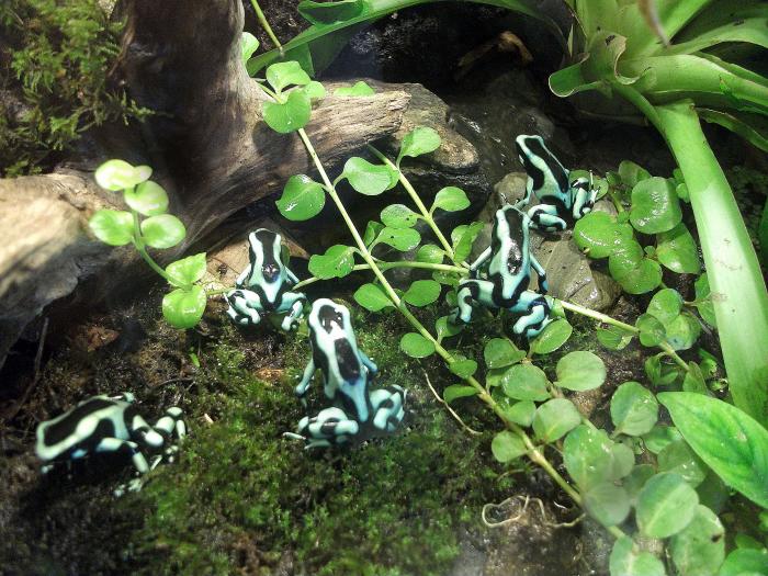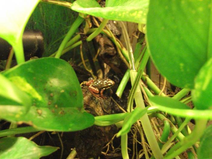 В интернете, при очередном розыгрыше выиграл уже первый приз: три изумительных лягушонка Ranitomeya variabilis. Удивительное везение, почти подряд два выигрыша. Поселил их в террариум к выигранным в прошлый раз Dendrobates auratus 'Blue". Войн и междуусобиц не наблюдаю, одни освоили верхние горизонты, вторые обитают ближе к грунту, но и те и другие могут быть и там и там.