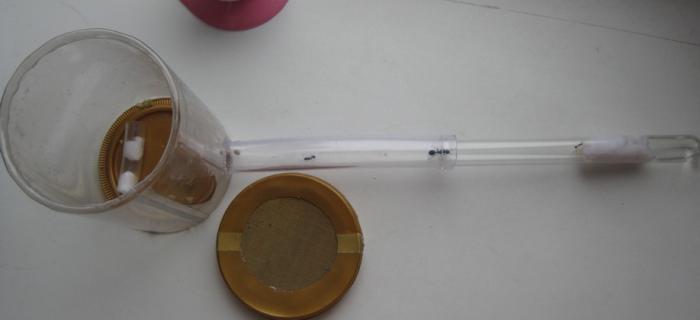 Сделал небольшую арену из банки от конфет, соединил пробирку с ареной прозрачной трубкой. Теперь есть место для развития колонии. Поилку сделал из такой же прозрачной трубки, только меньше диаметром , поместив внутри трубки с двух сторон кусочки ваты.