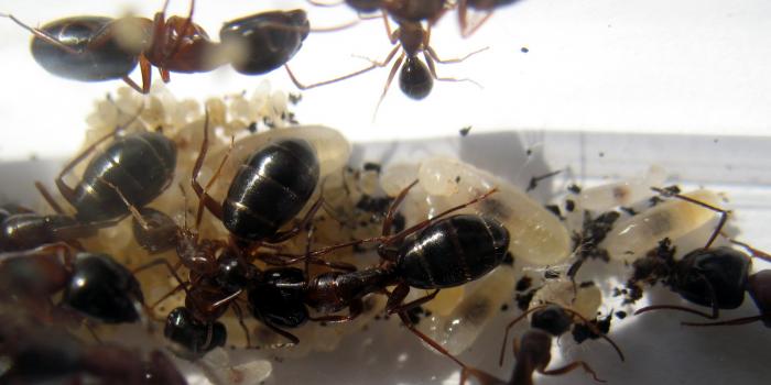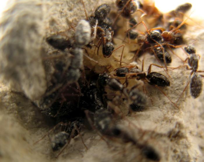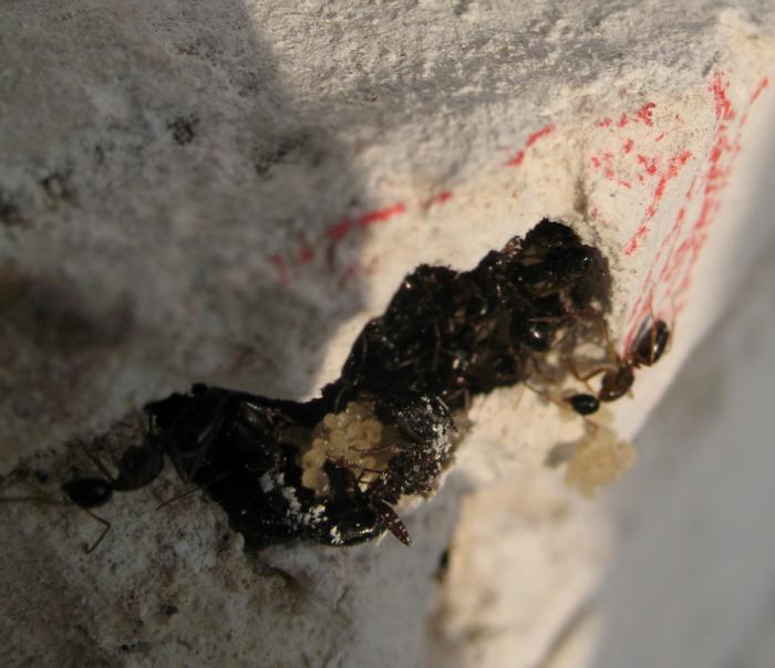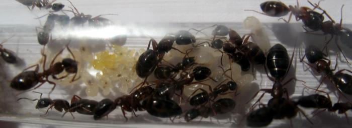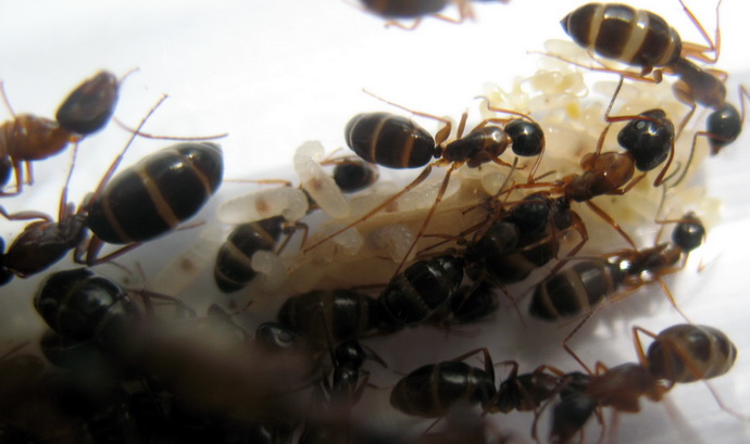 На этом фото рабочие и воины пытаются закрыть личинки от яркого света.