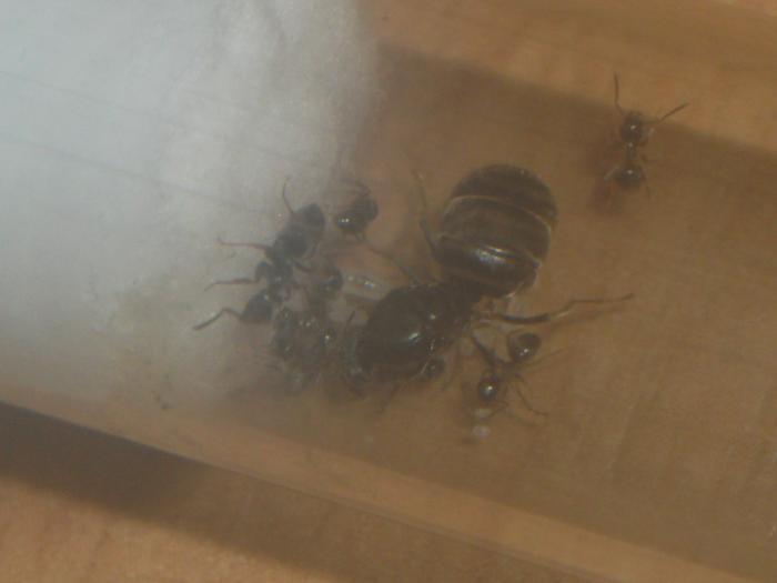 Итак, что за эксперимент спросите вы? Нет, это не клонирование:) Когда, на улице проснулись муравьи я подумал, что будет если я уличных муравьев подброшу домашним? Я подозревал, что будет драка, и решил все делать сторожно. Итак, первым делом из одного муравейника А(я его 2 года знаю), я сначала взял 3-х муравьев и подержал полчаса, потом по одному аккуратно стал сажат в семью, где было 2 муравья, эти мелкие(домашние муравьи раза в 3-4 меньше дикиш по обьему) сразу учуяли, что здесь чужак и набросились на первого, тот испугался, сначала убегал, но потом перестал. Мелкие начали ползать по нему и облилывать и при первых попытках удрать кусали за лапы (но не поливали кислотой), в итоге "чужак" притворился мертвым (лапы сжал, как мертвая муха). В конце концов муравьи завербовали его и он перешел на их сторону. Тоже самое произошло и остальными двумя. На следующий день из муравейника В (я знаю его 4 года) взял 3-х муравьев (эти гиганты раз в 5 больше домашних!...По обьему разумеется) и попробовал повторить процедуру. Но моим домашним муравьям завербовать их не удалось, 3 часа шла пассивная драка, в смысле встретятся, подеруться и разбегуться. Пришлось отсаживать. Зато те муравьи, где было 4 очень хорошо приняли всез 3-х. Ну и на следующий 3-ий день из муравейника А я выловил еще 2-х муравьев и переселил туда где было 5 муравьев. В итоге из 2 стало 7, и из 4 стало 7. Получается между теми муравьями, где было 2 и муравьями из муравейника В какая-то генная несовместимость, ну ладно я примерно понимаю почему не приняли их, а приняли муравьев их муравейника А. Кстати в вербовке участвовали только те 2-ое домашних муравьев, а завербованные сидели и ничего не делали, ну подходили к тем кого вербовали, нюхали (запах свой, поэтому не атаковали), и отходили. Я так понимаю, что при перевербовке запах не меняется, а муравьи запоминают конкрентого муравья, что он свой? И еще вопрос: не повредит ли моим муравьям, если я попробую поднять их численность искуственным способом до скажем 12-15? просто боюсь матка от скуки умрет одна (был печальный опыт с флавусами). В общем все.