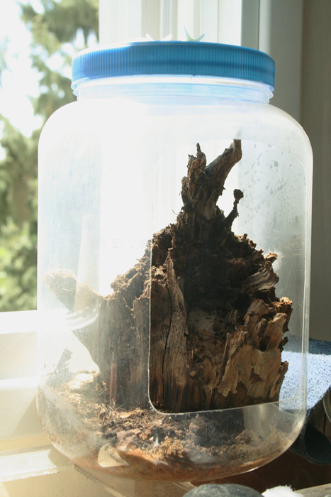 пень теперь выглядит вот так, стоит в пластиковой банке с землёй, "окно" можно закрывать и открывать по желанию, термиты накопали немного ходов вдоль стен и за ними частично можно наблюдать.